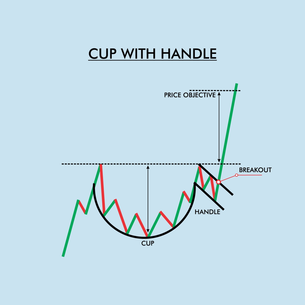 • Cup and Handle: A U-shaped “cup” followed by a slight downward drift (the handle). A breakout above the handle confirms the bullish trend.