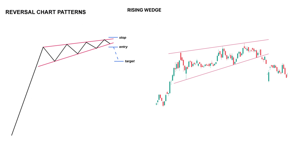 • Rising / Falling Wedges: Converging trendlines where the price is squeezed. A Rising Wedge often breaks downward, while a Falling Wedge often breaks upward.